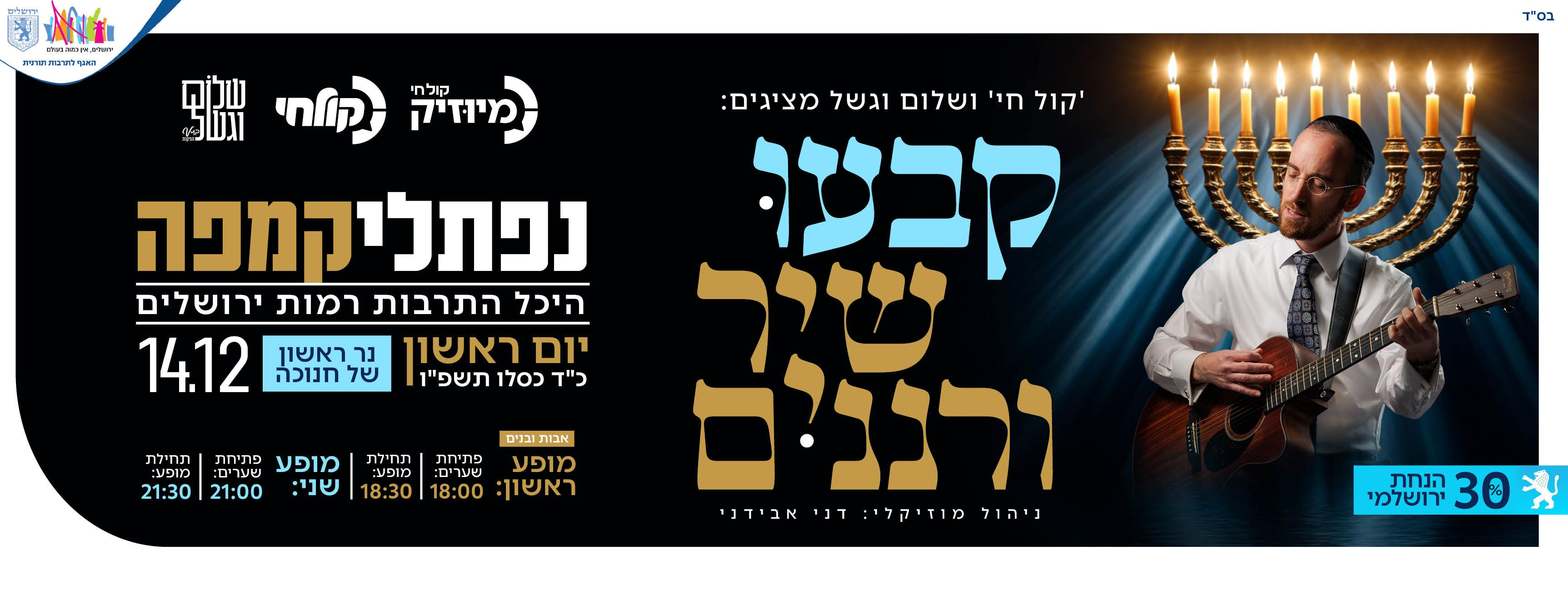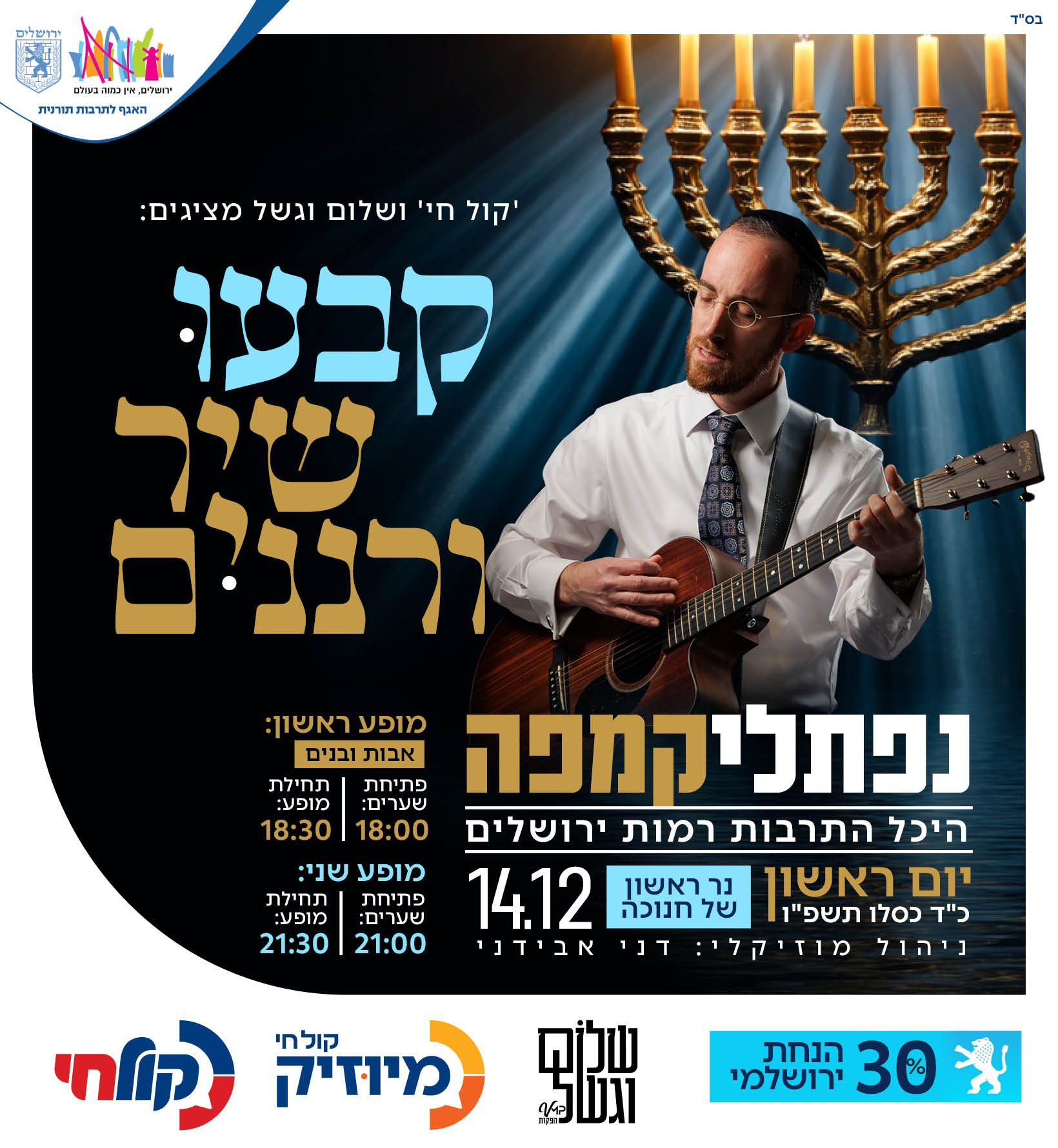 נפתלי קמפה היכל התרבות רמות ירושלים יום ראשון, נר ראשון של חנוכה ניהול מוזיקלי דני אבידני מופע ראשון: אבות ובנים פתיחת שערים: 18:00 תחילת מופע: 18:30 מופע שני: